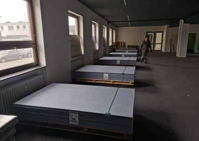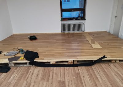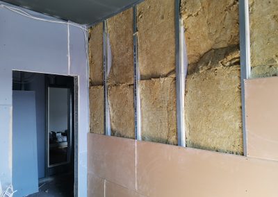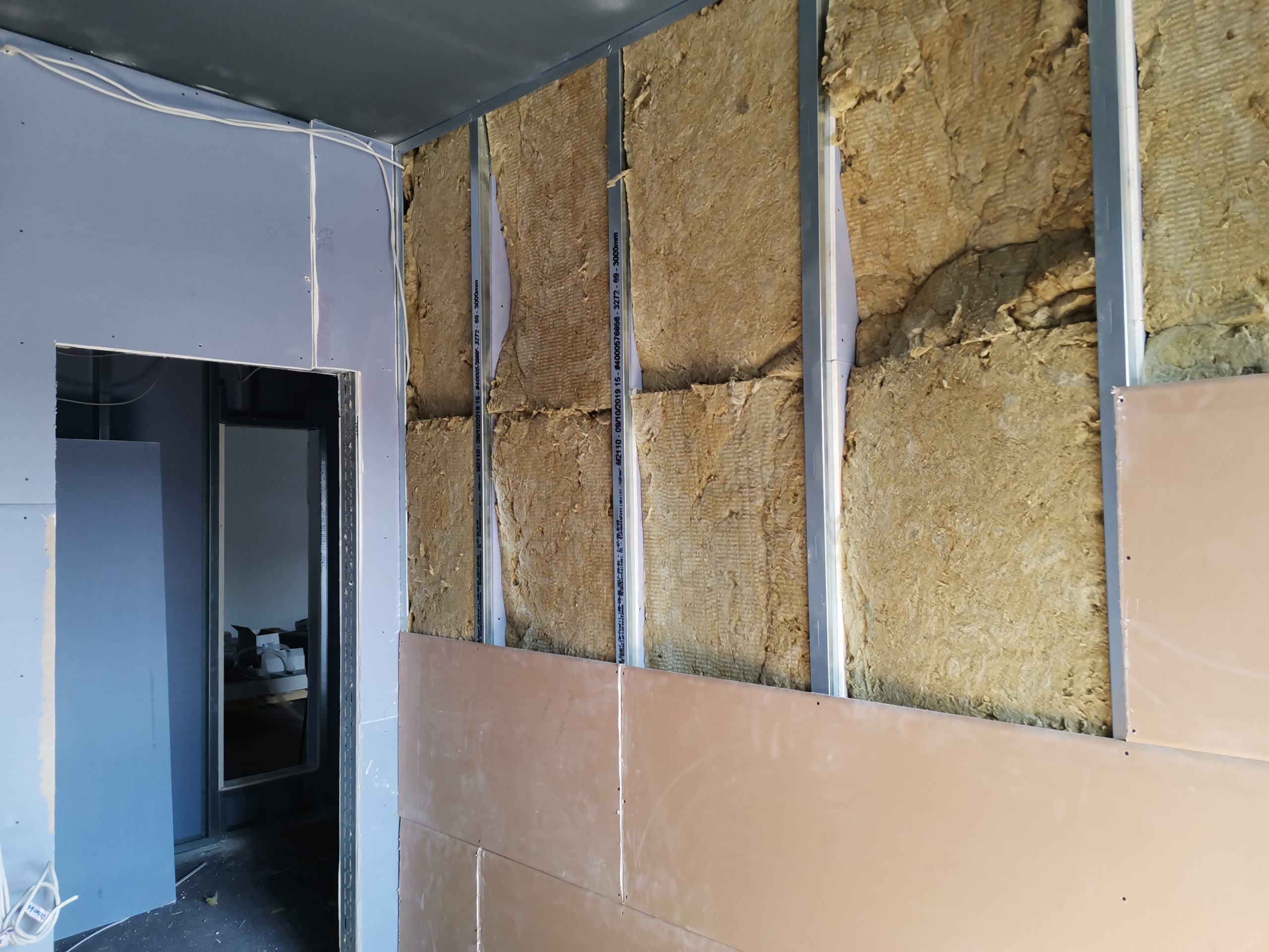 Der Ausbau erfolgte mit Trockenbauwänden. Aus der einstigen Halle enstanden sechs Unterrichtsräume, ein Büro, sowie ein kleiner Konzertsaal. Hierbei stand vor allem der Schallschutz im Vordergrund, denn es sollte möglich sein in allen Räumen gleichzeitig zu musizieren. Deshalb wurde mit doppeltem Städerwerk in zweifacher Beplankung mit Diamantplatten gearbeitet. Diese schwereren Platten gewährleisten in Kombination mit geeignetem Dämmmaterial eine gute schallisolierende Wirkung.