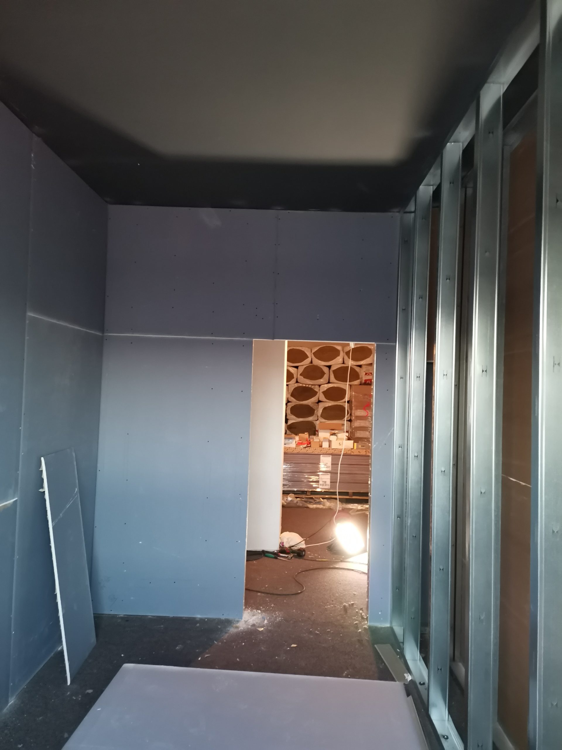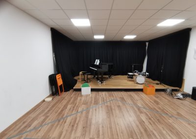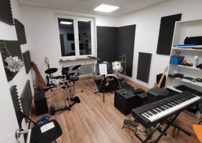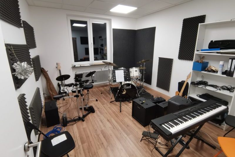 Eine besondere Herausforderung stellte der Schlagzeugraum dar. Hier wurde außer einer größeren Wandstärke und schwingungsentkoppeltem Ständerwerk zusätzlich eine noch schwerere Beplankung gewählt um die tiefen Basstöne zu absorbieren.