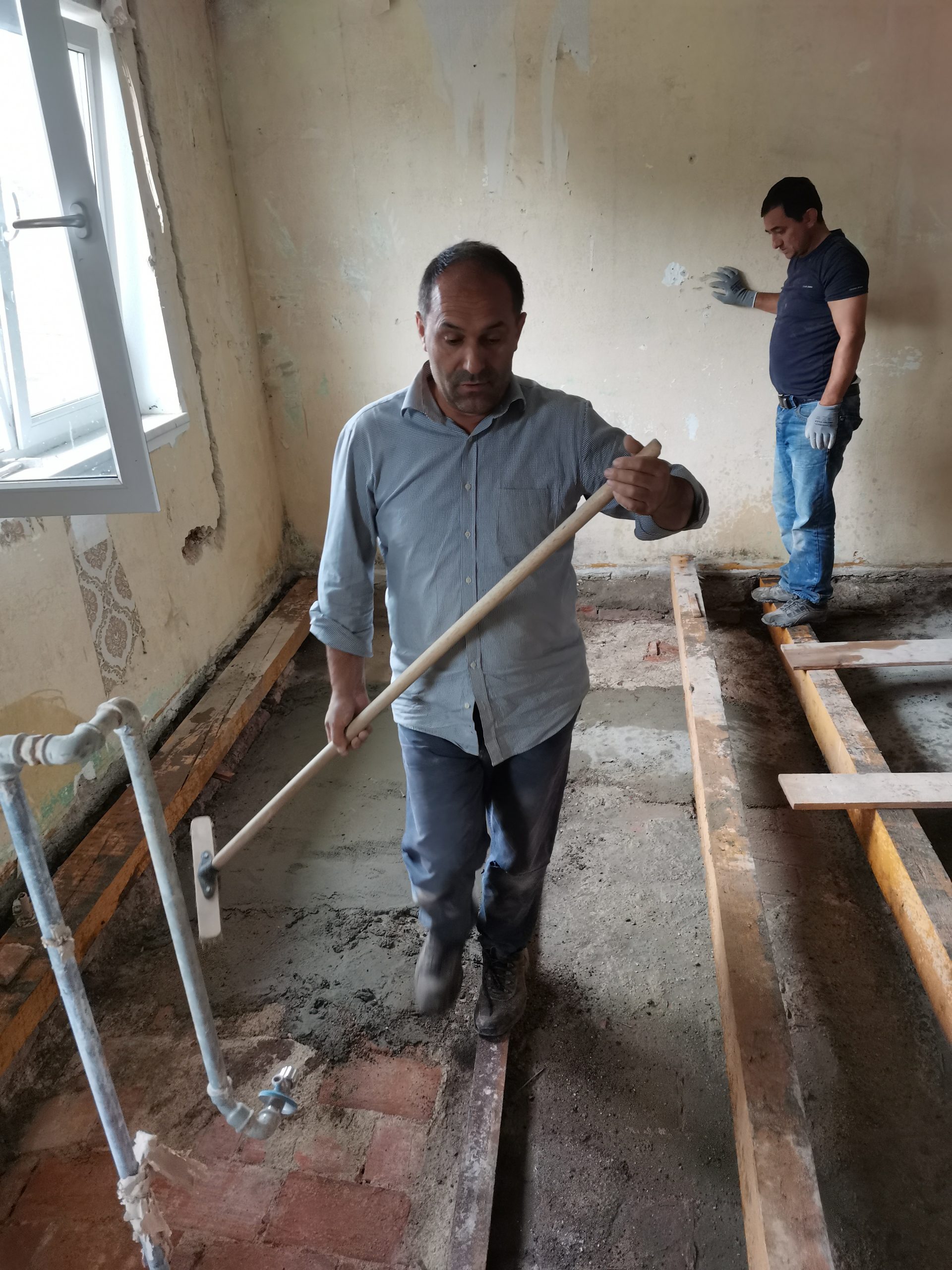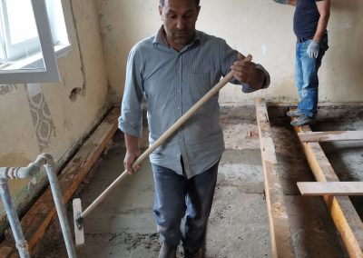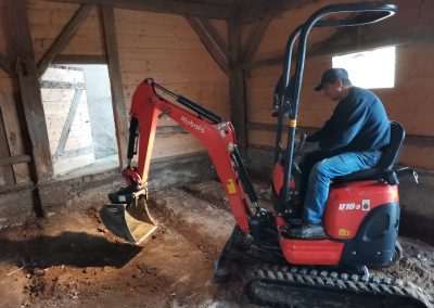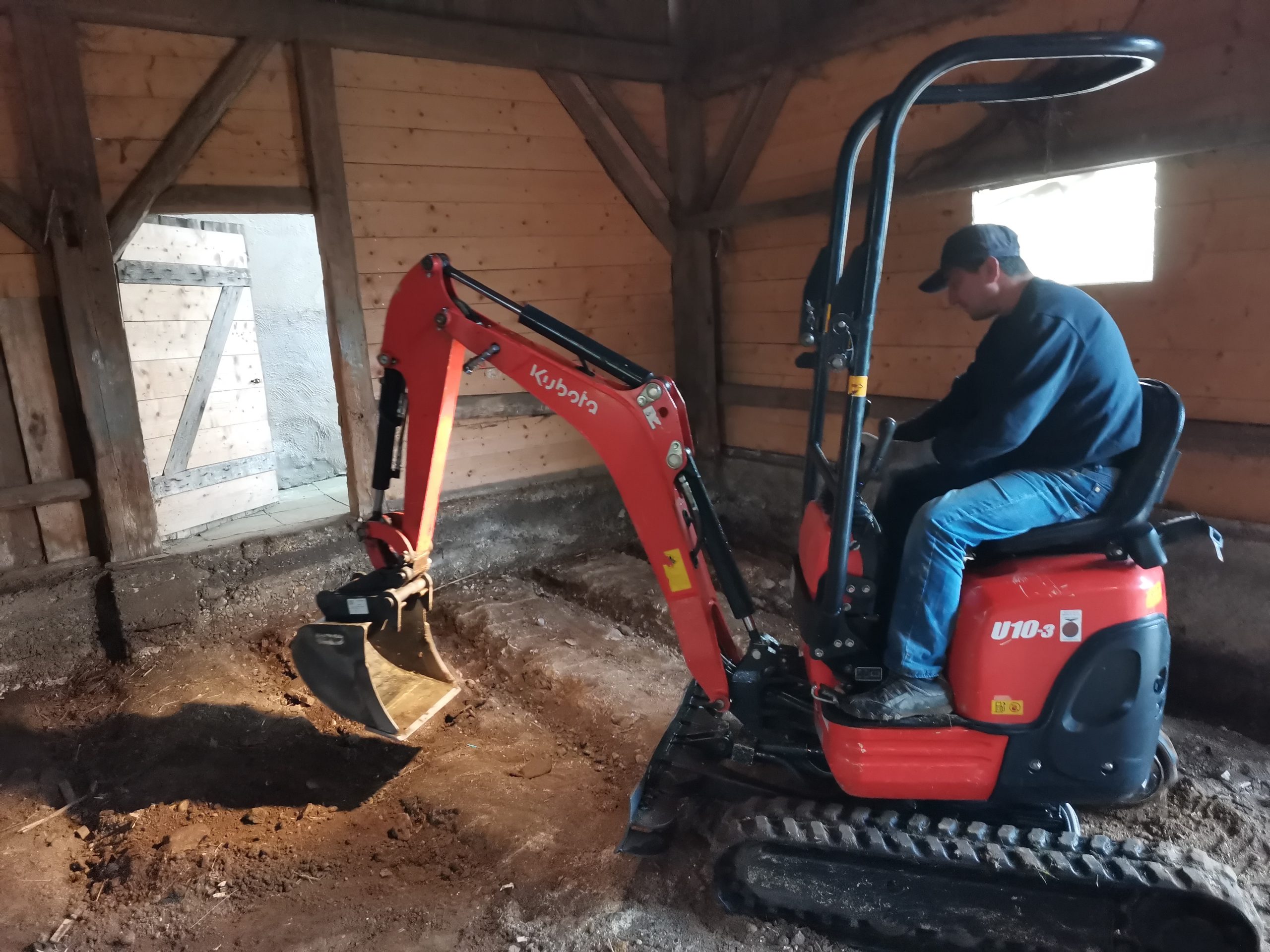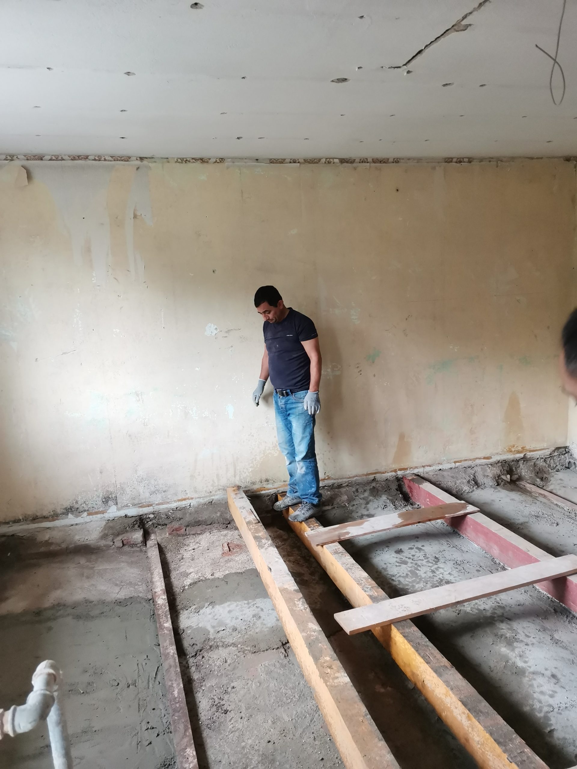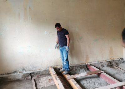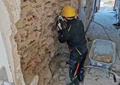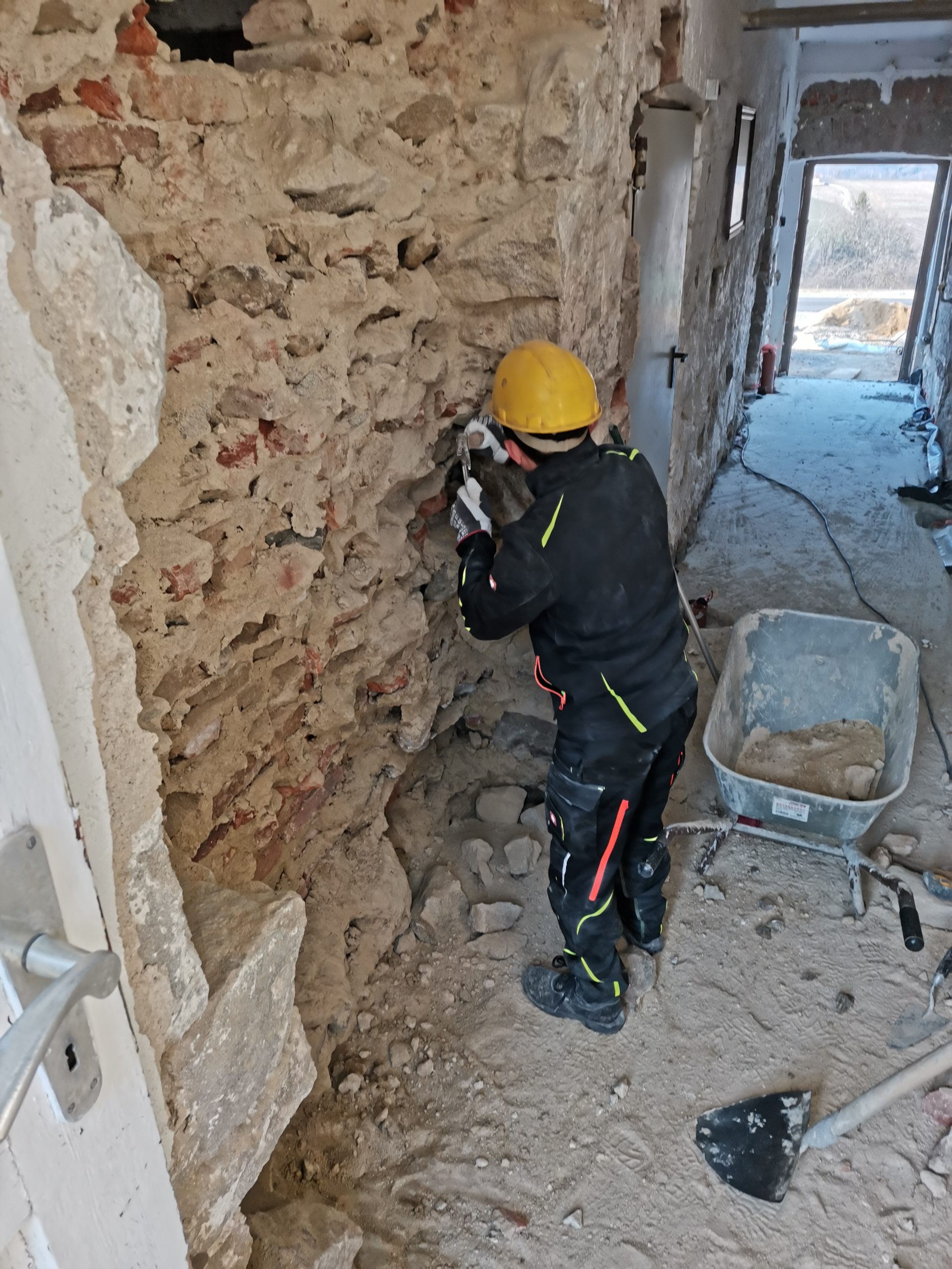 Unsere Aufgabe bestand zuerst im Rückbau bestehender Vorsatzschalen, im Rückbau und Entfernen alter Leitungen, im Entfernen und Öffnen nicht-tragender Mauern, im Entfernen von altem Putz, sowie in Erdarbeiten um nötige Aufbauhöhen für die neuen Fußböden zu erreichen.